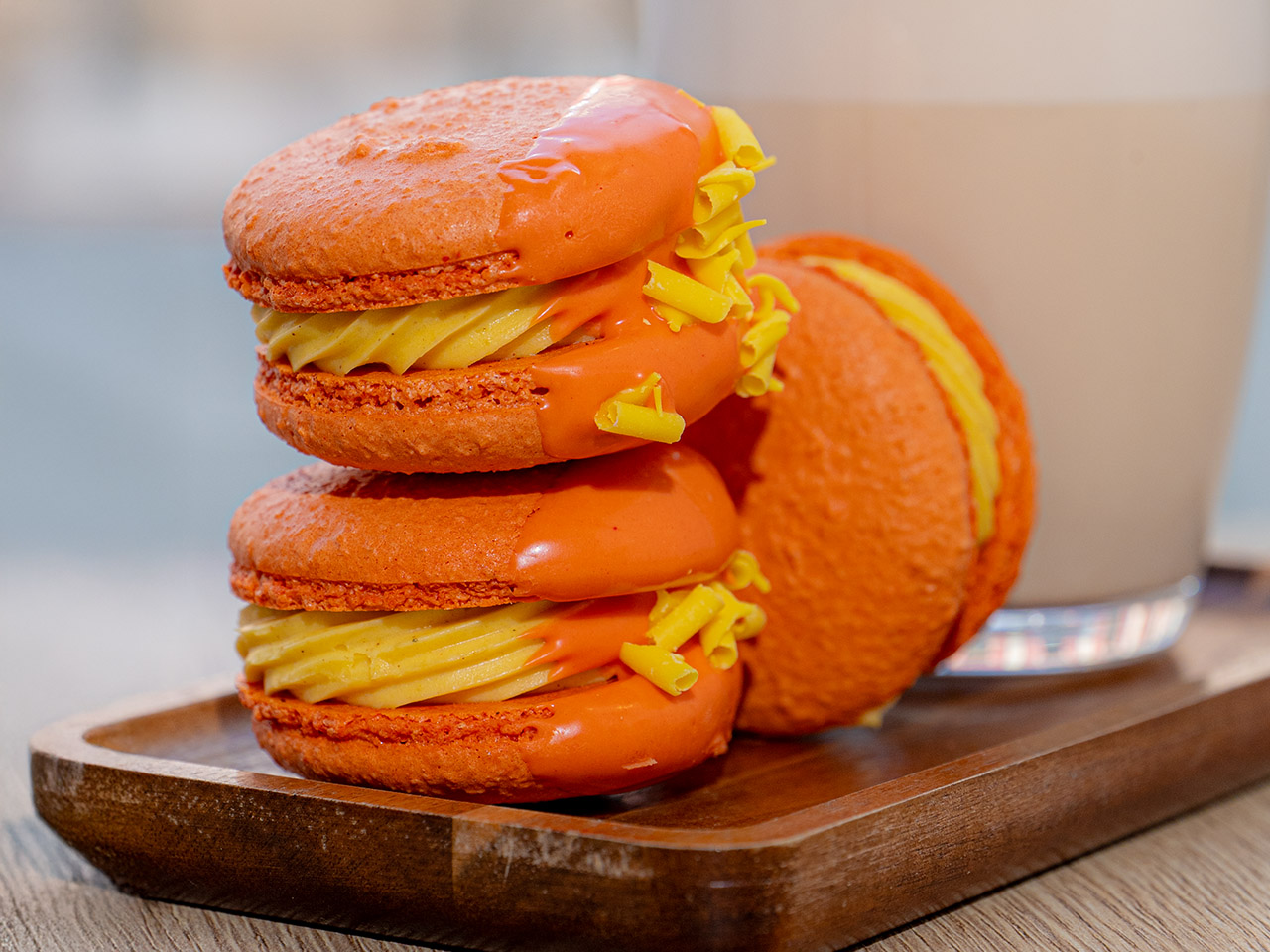 Each macaron is dipped in vibrant orange chocolate and decorated with fine chocolate curls, making it as eye-catching as it is delicious. The rich creaminess of pumpkin pairs beautifully with the light, airy macaron shells, creating a perfect balance of flavor and texture.